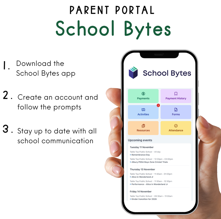 At Table Top Public School we use parent portal apps to make communication and admin easier for families. These tools help you: